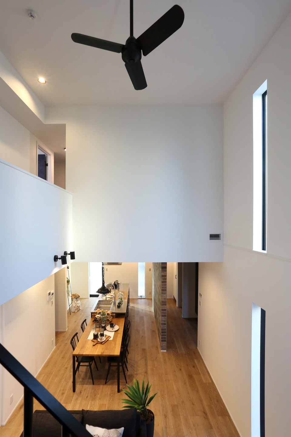 リビングに吹抜けがあるので開放的な空間になり、住宅街の家でも明るく光が降り注ぐ家にして頂きました。
